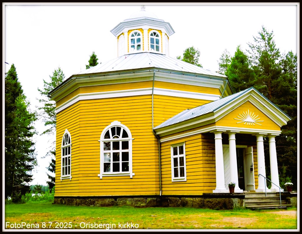 Kuvan tiedotOrisbergin ruukinkirkko Isossakyrössä on Orisbergin kartanon yksityinen kirkkorakennus, joka valmistui vuonna 1831 ja on erillisine kellotapuleineen Carl Ludvig Engelin suunnittelema. Orisbergin hirsinen kahdeksankulmainen kirkko, Kotilammin rannassa oleva avoin temppelipäätyinen kellotapuli ja kirkkoon liittyvä hautausmaa ovat osa Orisbergin hyvin säilynyttä ruukinaluetta, joka sisältyy Museoviraston inventoimiin valtakunnallisesti merkittäviin rakennettuihin kulttuuriympäristöihin.Avainsanat: Viikon kuvat Kuvakoot: Esikatselukuva Pieni kuva Suuri kuva Alkuperäinen kuva Kuvaa on katsottu 32 kertaa |